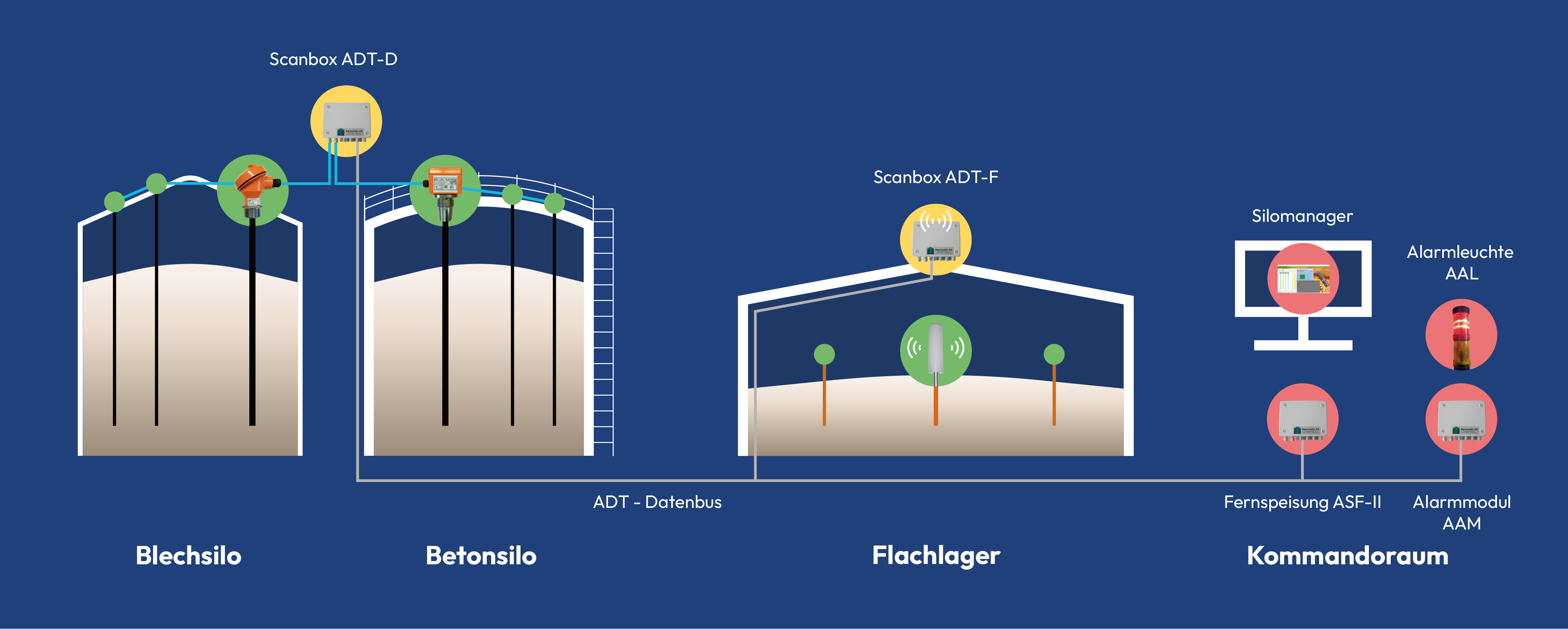 Zur Temperatur-Messwerterfassung dienen Messkabel oder Stechsonden (grün) welche mit der entsprechenden Scanbox (gelb) erfasst und mit der Silomanager Überwachungseinheit (rot) ausgewertet werden
