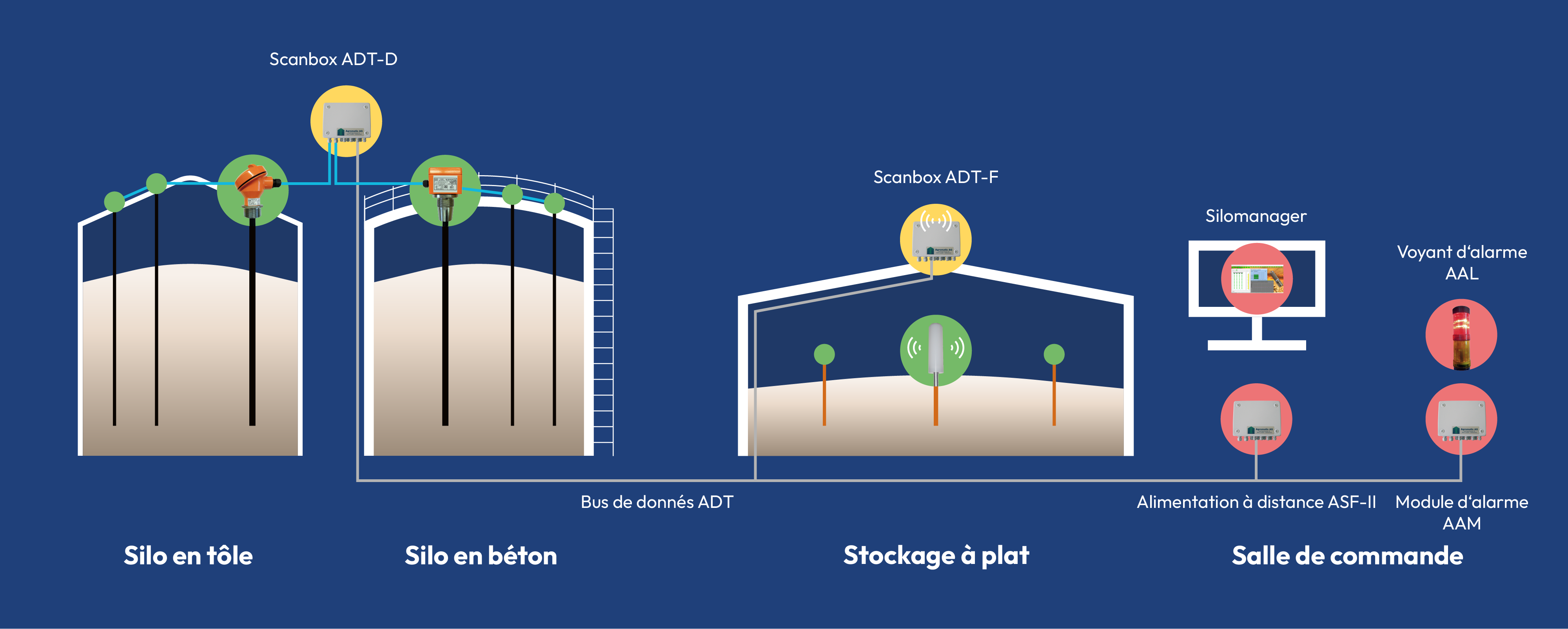 La mesure de la température est enregistrée à l'aide de câbles de mesure ou de sondes de perçage (vert), qui sont enregistrés avec le boîtier de numérisation correspondant (jaune) et évalués avec l'unité de surveillance Silomanager (rouge).